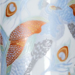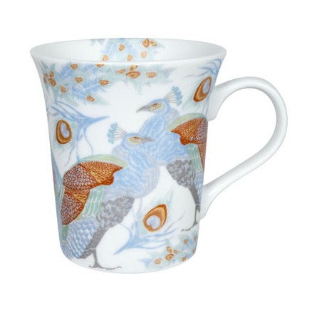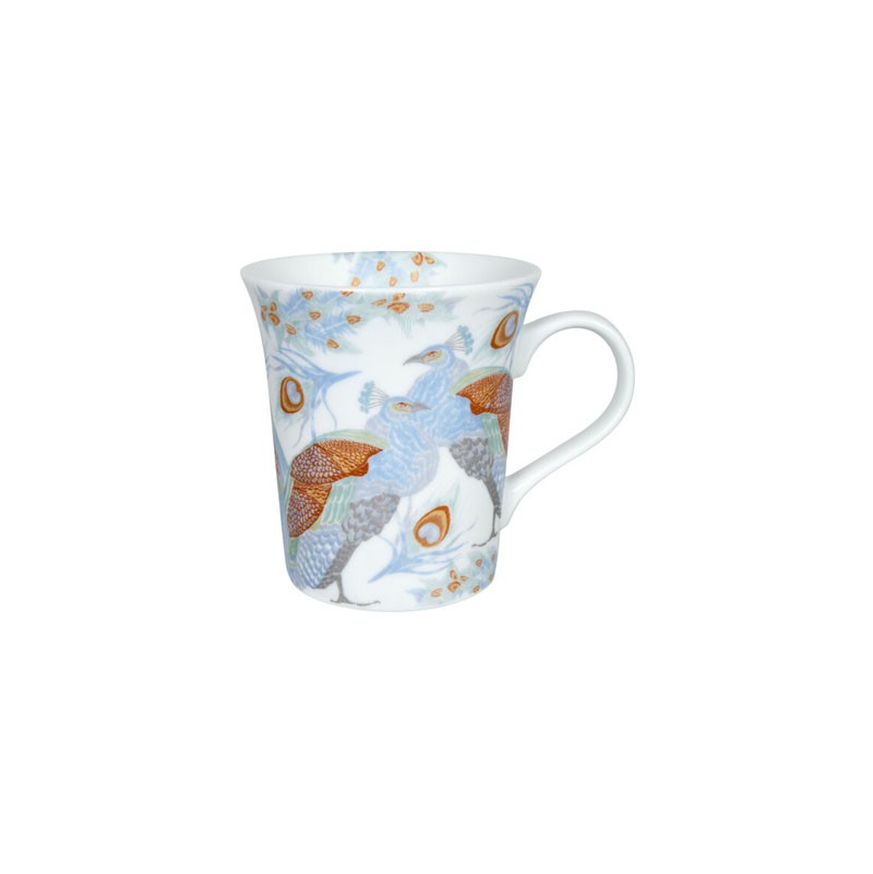 Taza con decoración de pavo real con brillos iridiscentes ¡bonita y grandota! Para que tu ritual del té dure un buen rato.