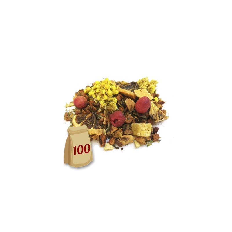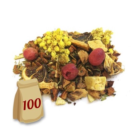 Ingredientes: Manzana, piña, papaya, limón, hierba luisa, arándanos, flores de cártamo, acerola y pétalos de asteraceae.